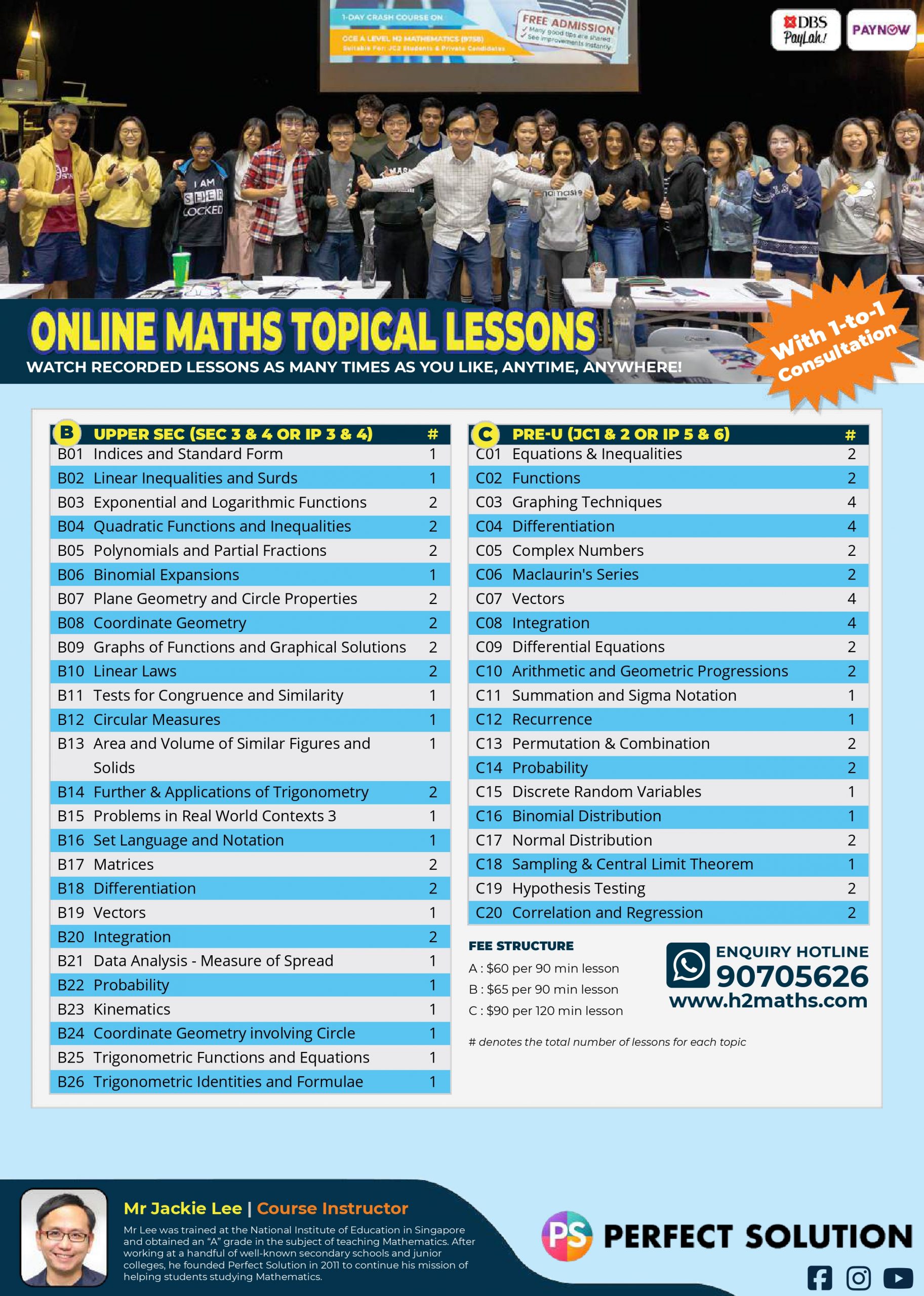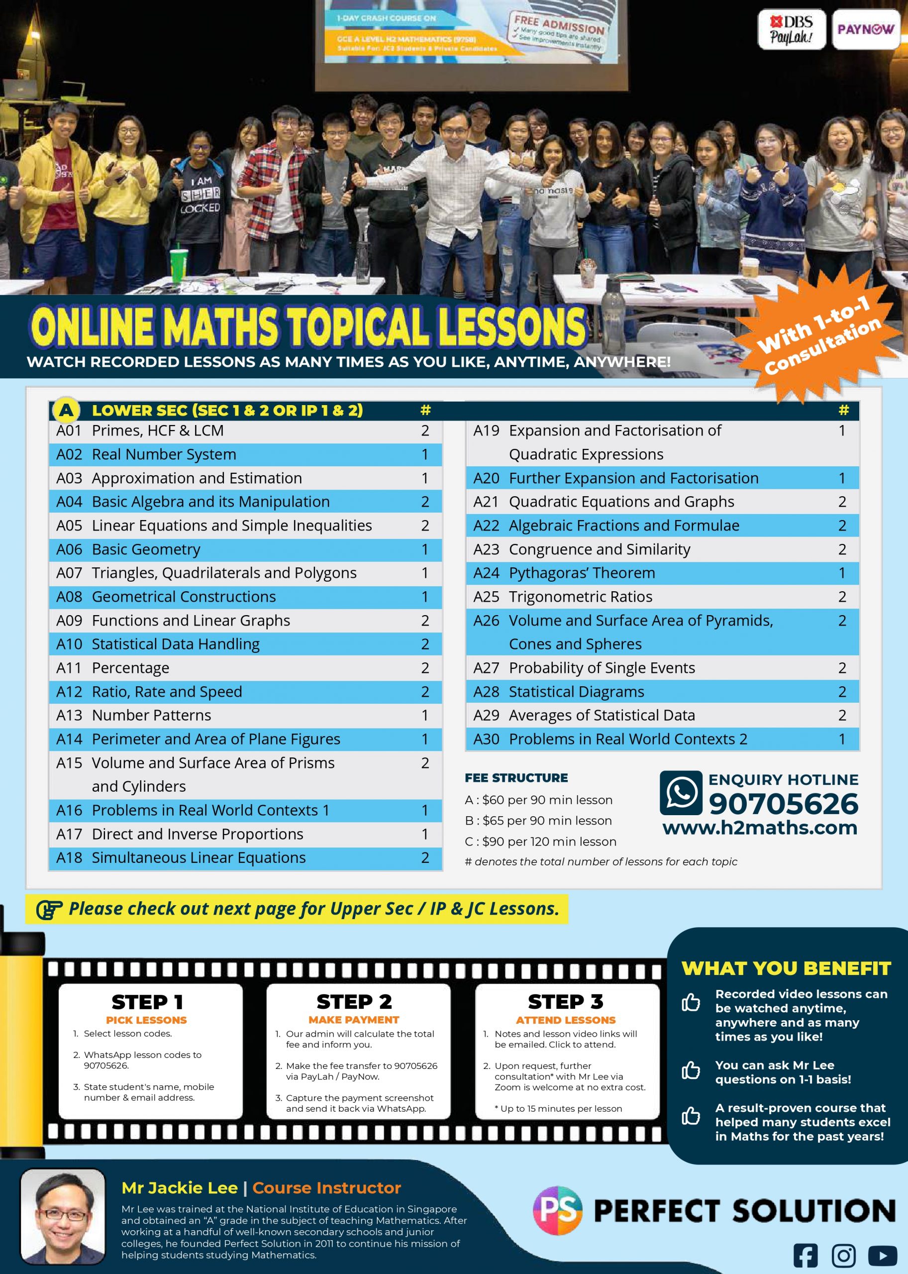 Mr Jackie Lee and Perfect Solution Education Group offers on-demand video lessons designed to help students excel in math. Whether you’re preparing for PSLE, O-Level, JC (H2), or IB, his expertly crafted videos provide comprehensive explanations, step-by-step solutions, and practical tips for mastering mathematical concepts.